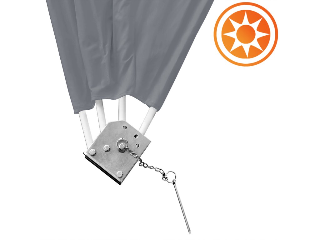 Prodyšná stínící clona. Vysoce odolná (95% UV ochrana) proti slunečním vlivům a vlhkosti. Snadné ukotvení kdekoliv na zahradě i na dovolené.