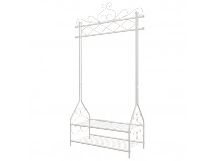 Kovový předsíňový věšák na kabáty a doplňky s 8 háčky v různých výškách a odkládací policí uprostřed ocelové konstrukce v bílém provedení.