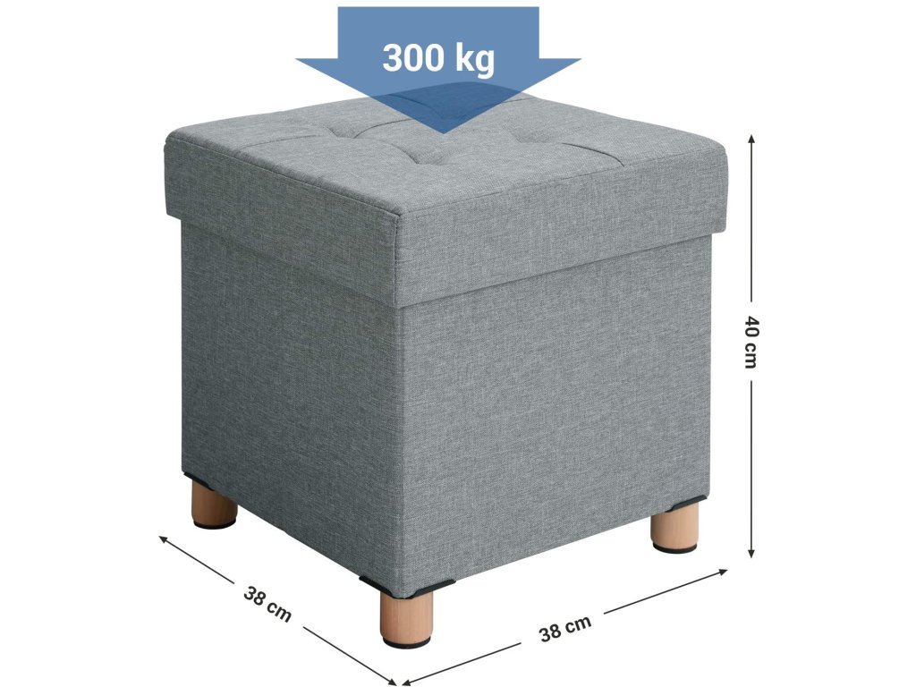 Krásný taburet bude skvělým doplňkem a praktickým pomocníkem. Taburet s dřevěnými nohami chrání před nečistotami a unese velké zatížení. Silné polstrování z měkké pěny o průměru 5 cm umožňuje optimální pohodlí při sezení a slibuje dobrou pružnost. Skládací taburet s úložným prostorem je univerzální, takže jej využijete jako útulný úložný prostor pro nohy, jako další sedadlo a nebo jako dekoraci v dětském pokoji. Montáž je nenáročná a zabere jen pár minut.
