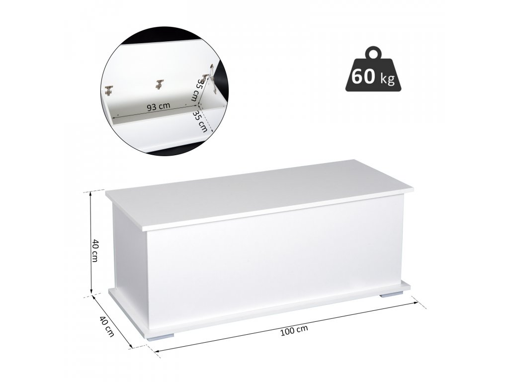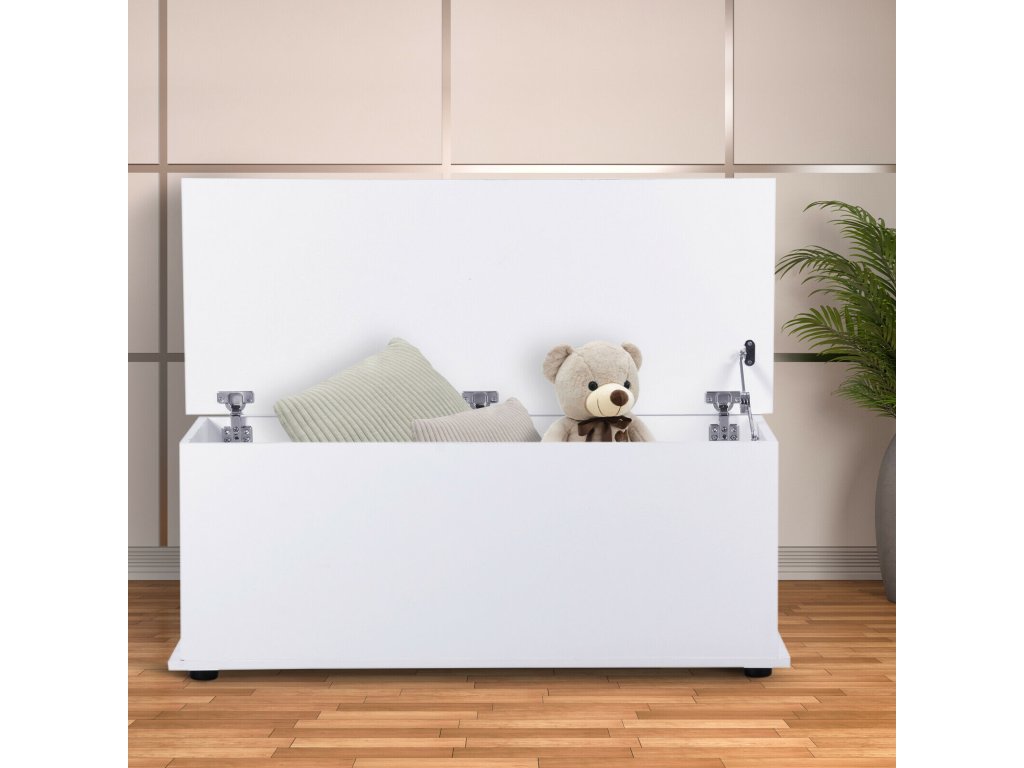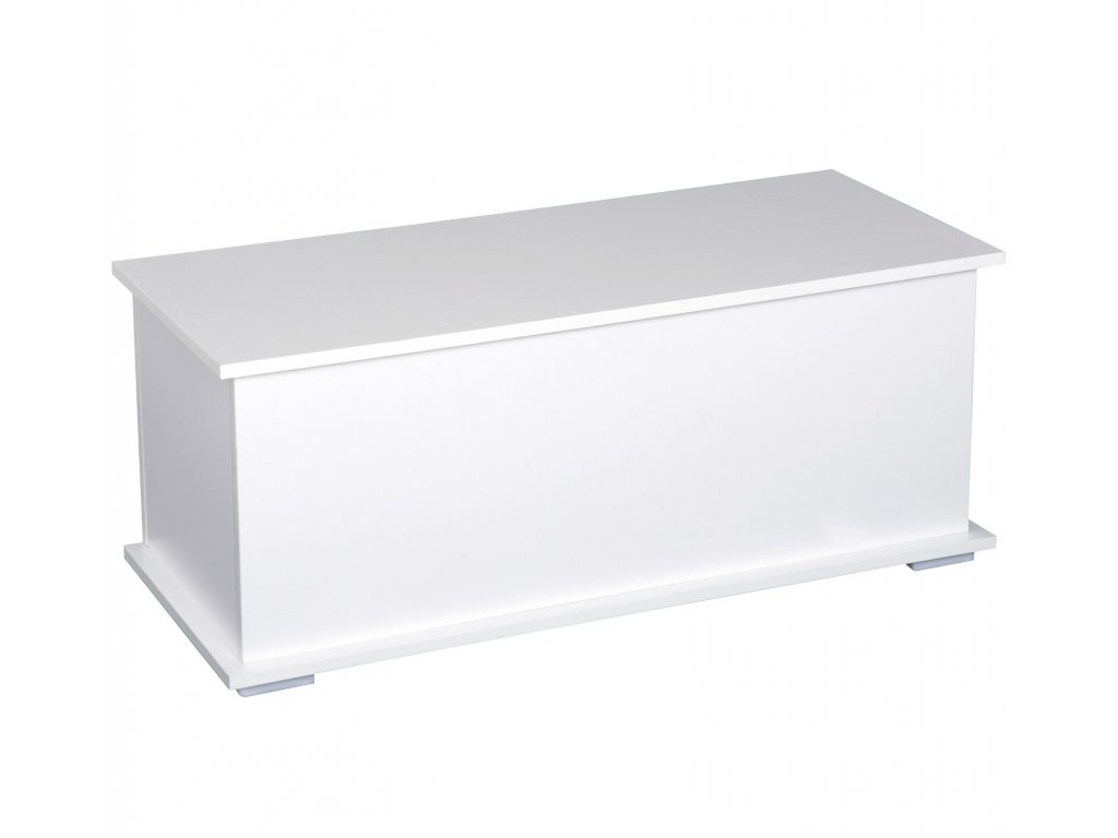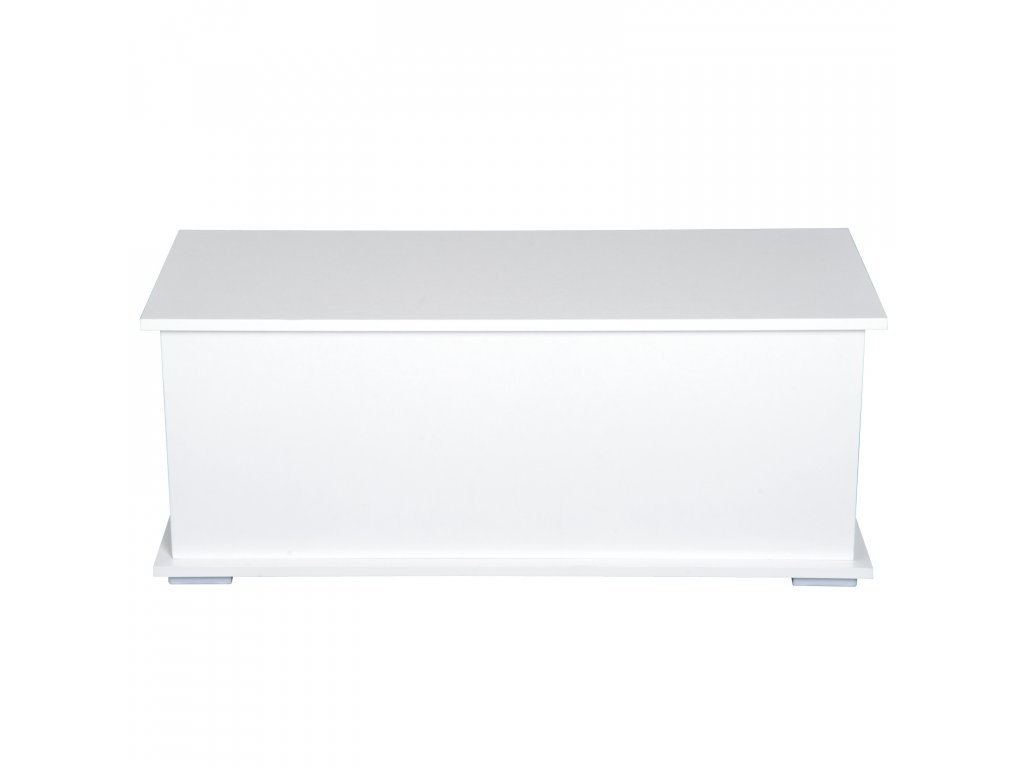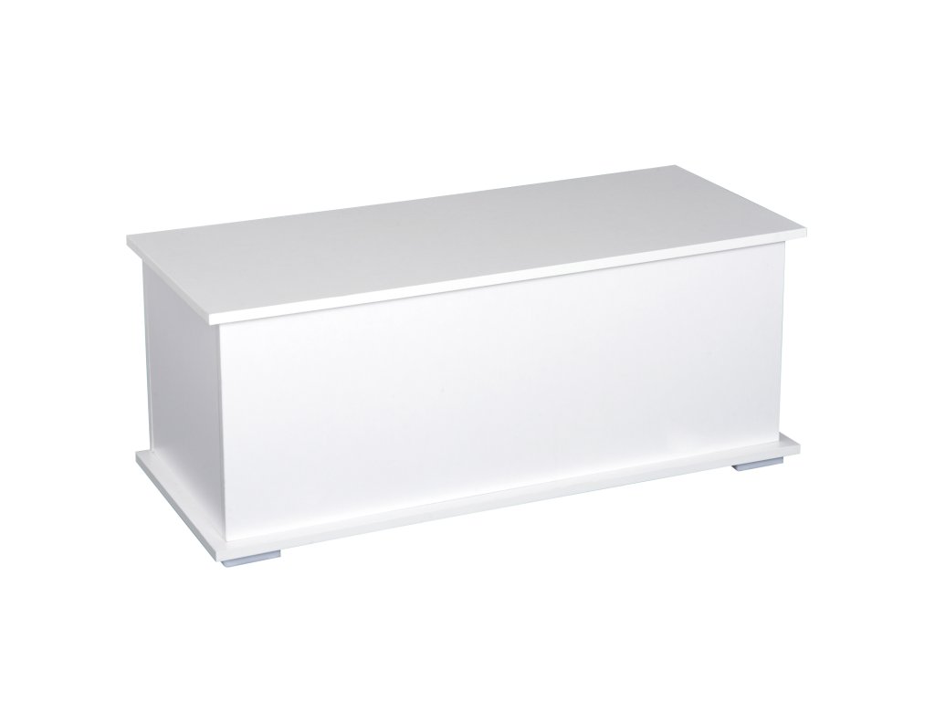Dřevěná truhla s praktickým skladovacím prostorem v jednoduchém elegantním designu. Plynový píst pro snadné otevření víka. Barva bílá.