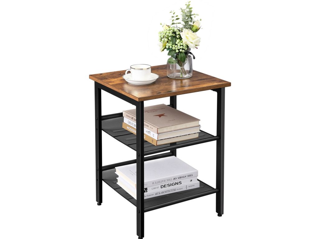 Odkládací stolek v industriálním designu v kombinaci barev hnědé a černé. Praktický pomocník do vaší domácnosti.