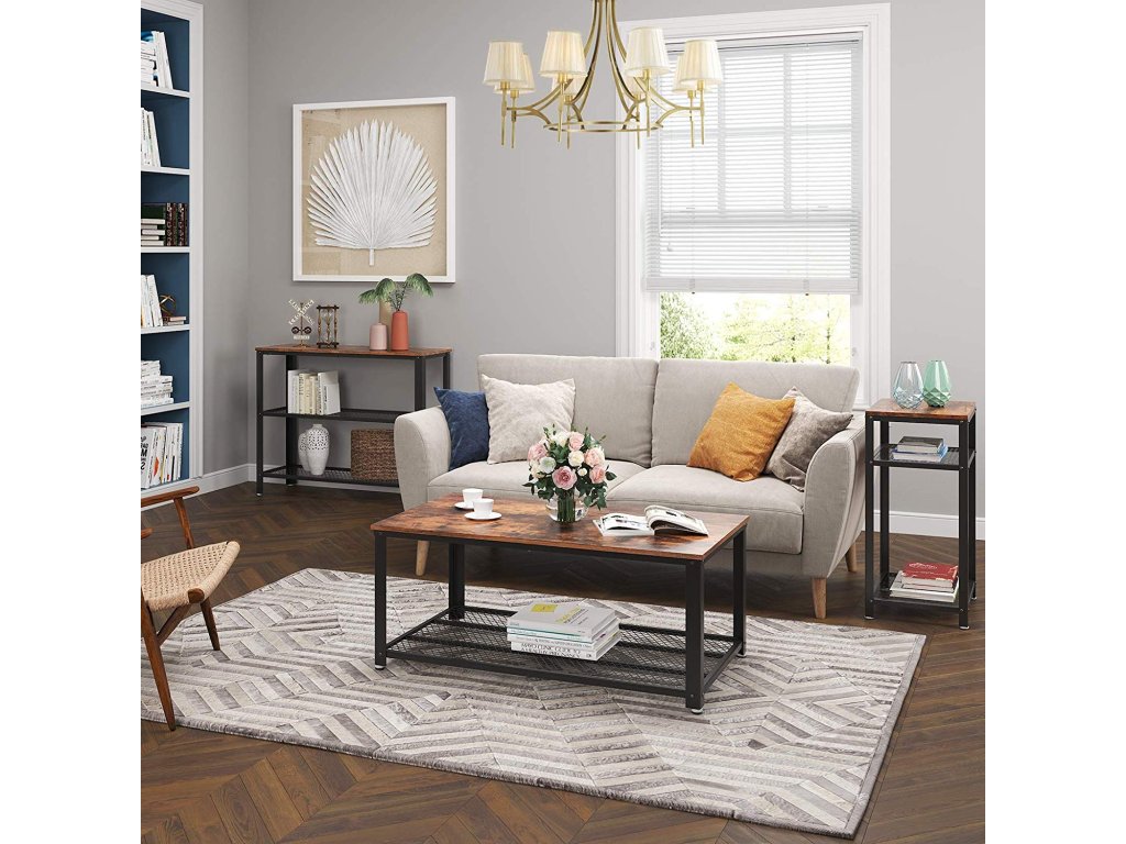 Konzolový či odkládací stolek v industriálním stylu dodá vašemu interiéru osobitý nádech. Kombinace rustikální dřevěné desky a kovové konstrukce propůjčuje tomuto konferenčnímu stolu starobylý vzhled. Starožitný design vytvoří útulnou atmosféru v obývacím pokoji, jídelně nebo hale a zároveň poskytne další úložný prostor na knihy, časopisy, dekorace a jiné maličkosti.