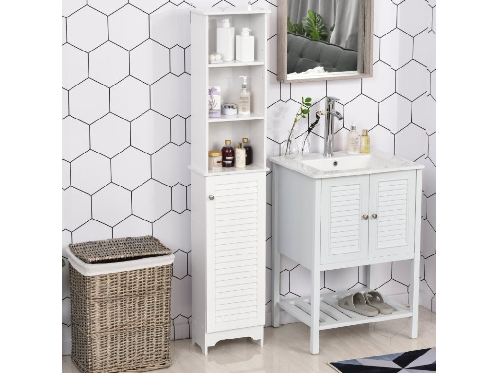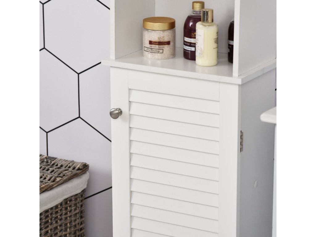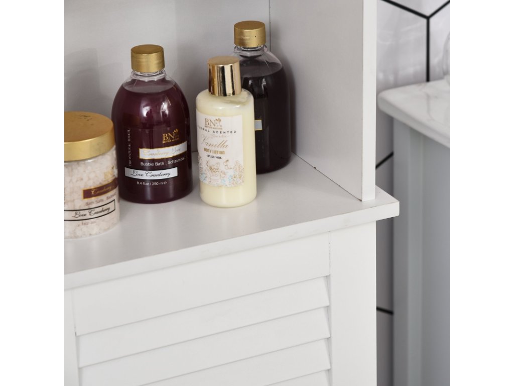 Prostorná koupelnová skříňka poskytuje místo pro Vaše ručníky, kosmetiku a další nezbytné vybavení. Disponuje 3 otevřenými policemi a 3 uzavřenými policemi.