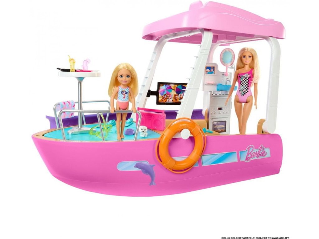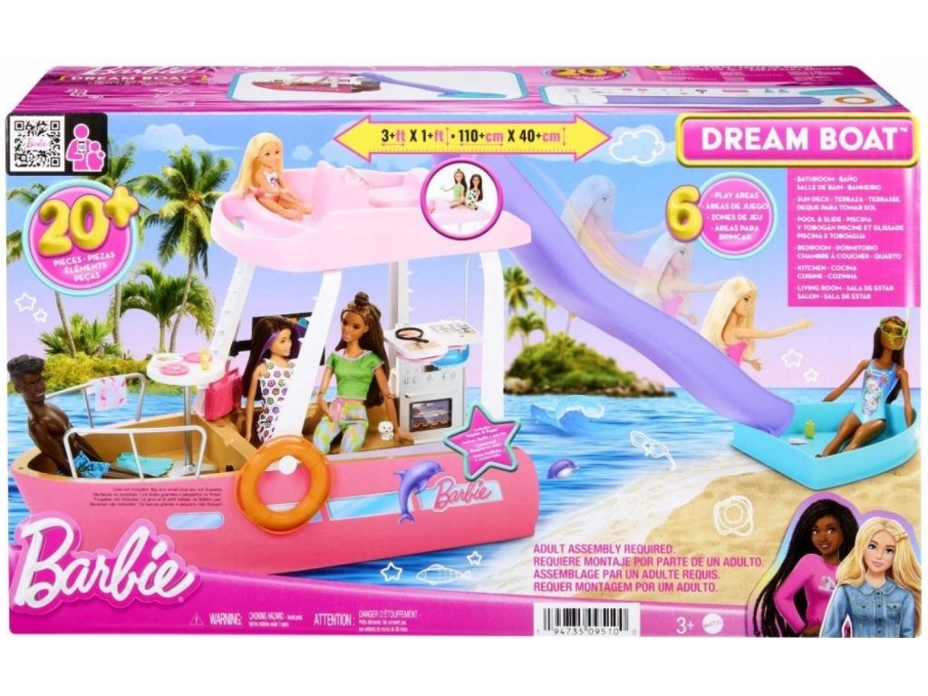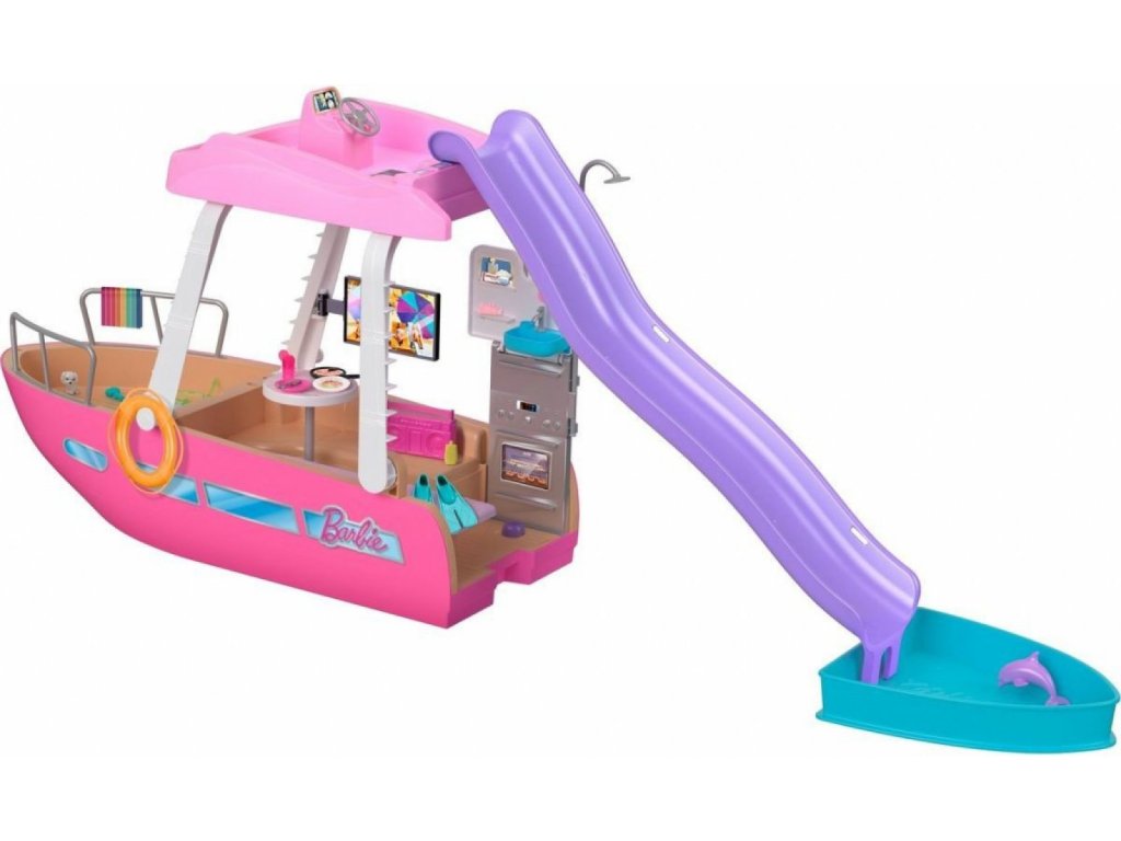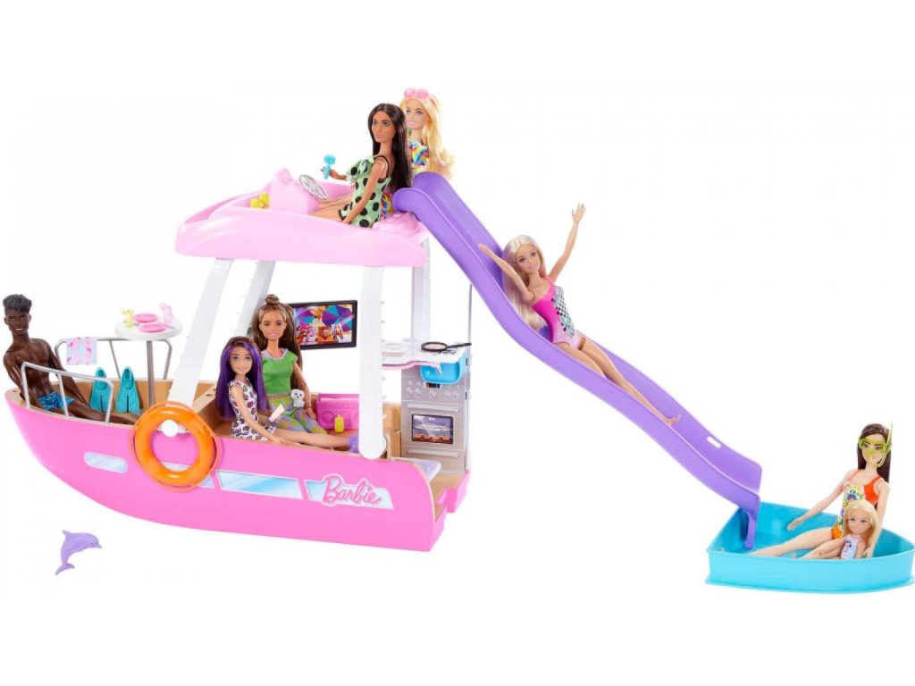 S touto Barbie Dreamboat se můžeš pustit do úžasných námořních dobrodružství! Tato sada obsahuje více než 20 dílků a 6 hracích ploch, jako je bazén a skluzavka, a je ideální pro snění o vodních dobrodružstvích. Sada je 91 cm široká a 30 cm vysoká, takže v ní má Barbie dostatek místa, aby mohla pozvat své kamarádky na slunečný výlet. Bábka není součástí balení. Barvy a dekorativní prvky se mohou lišit. Ponoř se do světa zábavy se sadou Barbie Loď snů. Sada potěší prvotřídními detaily, jako je bazén, skluzavka, 2 proměny a další překvapení. Panenka Barbie může vylézt na horní palubu, řídit loď a vyhřívat se na slunci, a pak se sklouznout po skluzavce přímo do vody. Odstraň horní palubu a získej snadný přístup ke zbytku atrakcí. Panenka není součástí balení. Šest hracích ploch zahrnuje koupelnu, opalovací palubu, bazén se skluzavkou, ložnici, kuchyň a obývací pokoj. Obývací pokoj a kuchyň můžeš během několika sekund přeměnit na ložnici a koupelnu! Součástí lodi Barbie je více než 20 doplňků. Nechybí vodní doplňky, jako jsou ploutve a potápěčská maska, a další jedinečné předměty včetně podvodního fotoaparátu, jídla, nápojů a boomboxu. Pes a delfín jsou ideálními společníky pro letní výlety na moře s Barbie. Vydej se na širé vody s Barbie lodí snů. Skvělý dárek pro děti od 3 let..