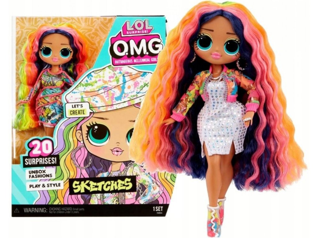 LOL Surprise! OMG Core je sada se stylovým Sketches panenkou a 20 překvapení s duhovými motivy. Panenka mkrásným rys obličejem, dlouhým kudrnaté duhové vlasy, a její oči jsou zelené. Na sobě má barevné šaty, a na nohou boty na podpatku.Panenka má několik kloubových bodů, takže s pomocí lidské ruky může zaujímat množství póz.