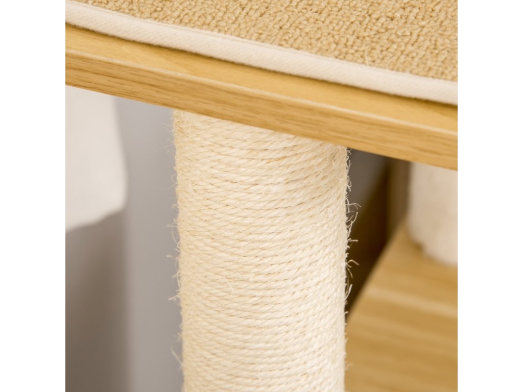 Stabilní kočičí strom s mnoha odpočívadly, domkem, provázkem a plyšovou kuličkou na hraní. Barva béžová.