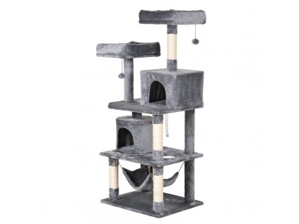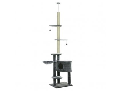 Stabilní kočičí strom s prostorným domkem, žebříkem a plyšovými odpočívadly. Barva šedá.