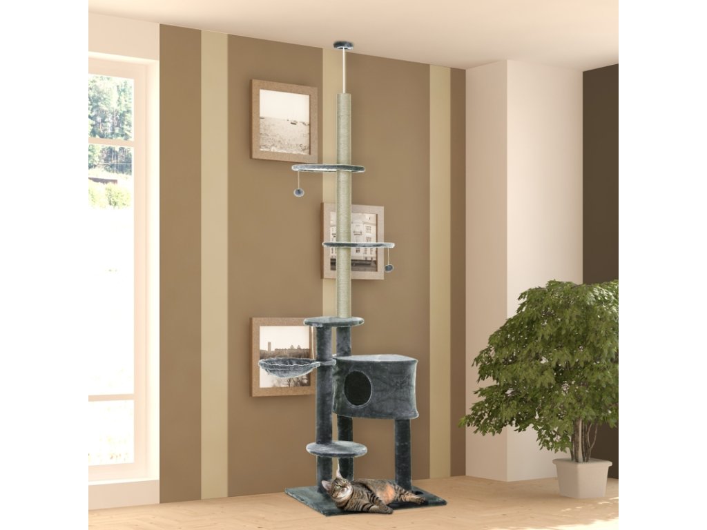 Stabilní dřevěný kočičí strom s prostorným domkem a mnoha plyšovými odpočívadly. Barva šedá.