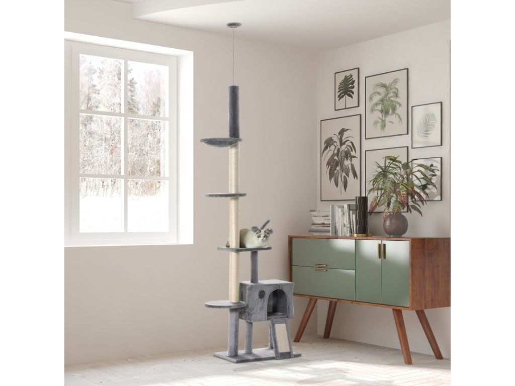 Stabilní kočičí strom s prostorným domkem, mnoha plyšovými odpočívadly a silnými sisalovými kmeny.