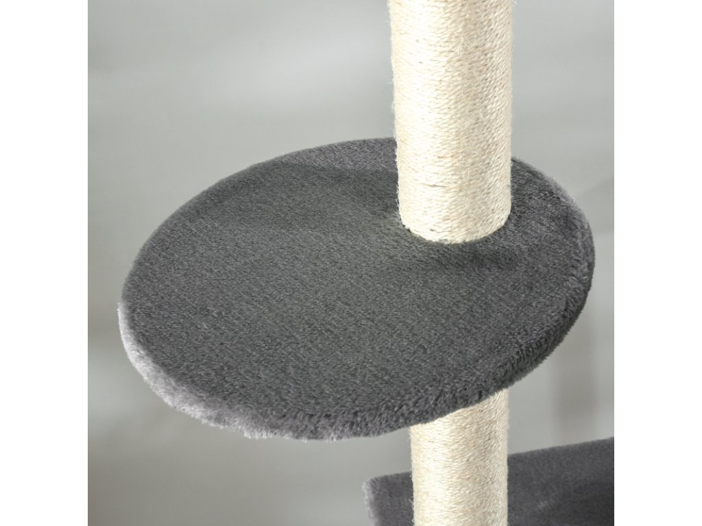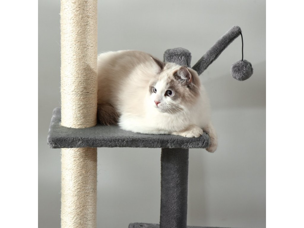Stabilní kočičí strom s prostorným domkem, odpočívadlem a plyšovou kuličkou na hraní. Barva šedá.