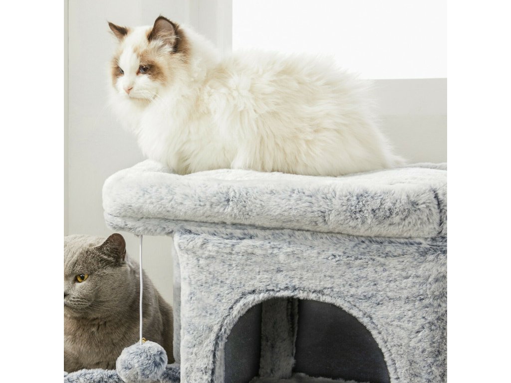 Velký škrabací strom v šedém provedení. Vhodný pro více koček. S 2 velkými domky, extra měkkými miskami a 6 odpočívadly v různé výšce.