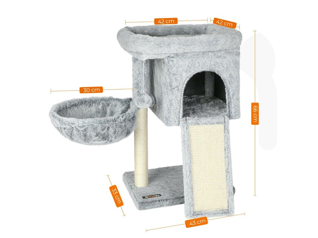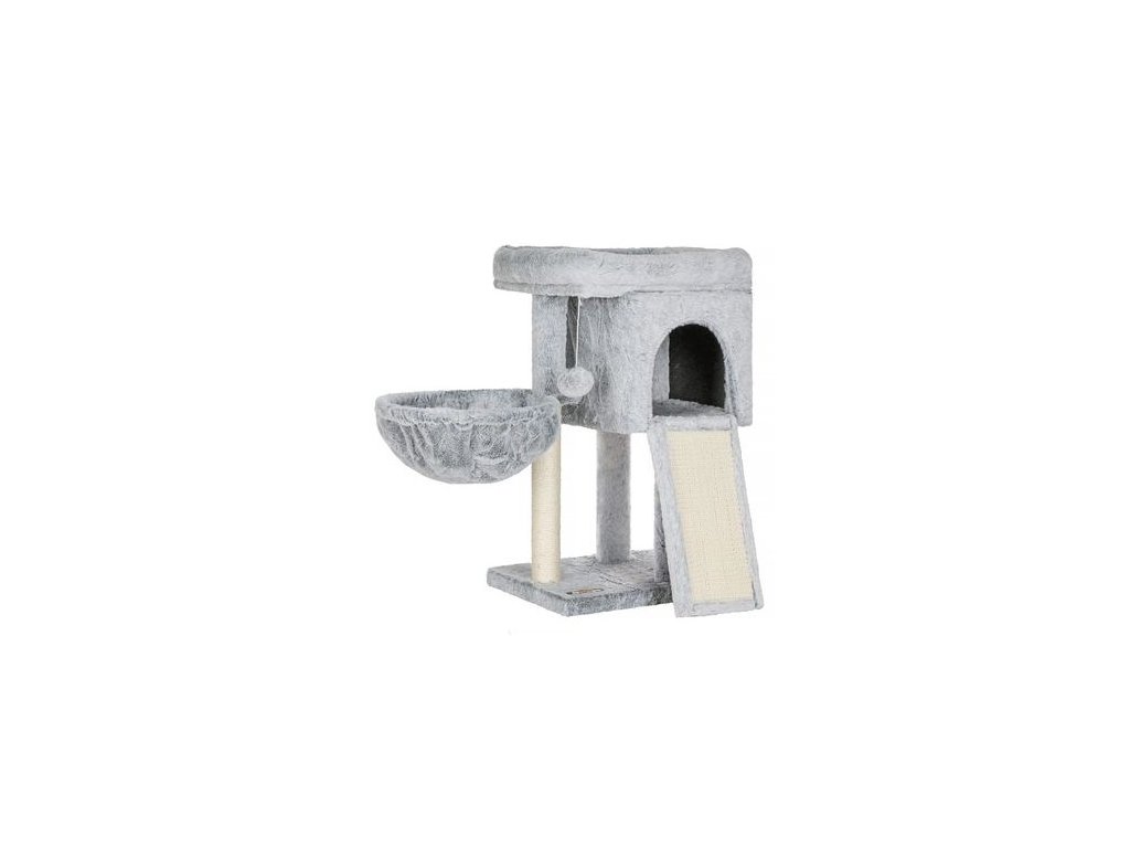 Stabilní kočičí strom s prostorným domkem, plyšovými odpočívadly a žebříkem. Barva světle šedá.