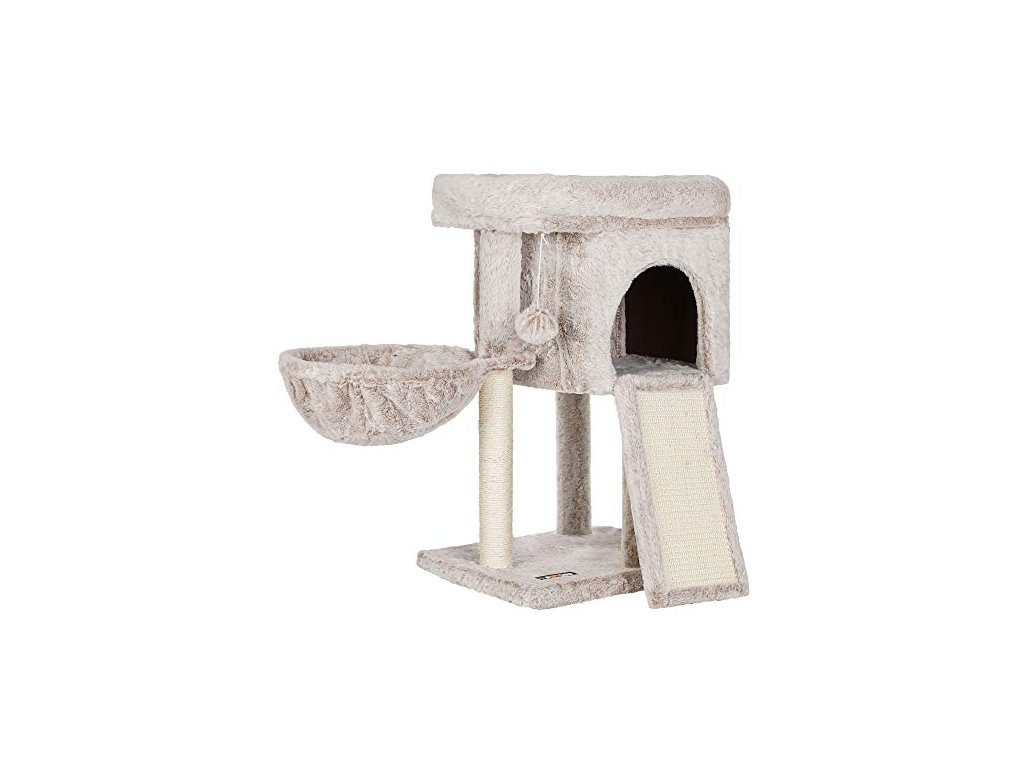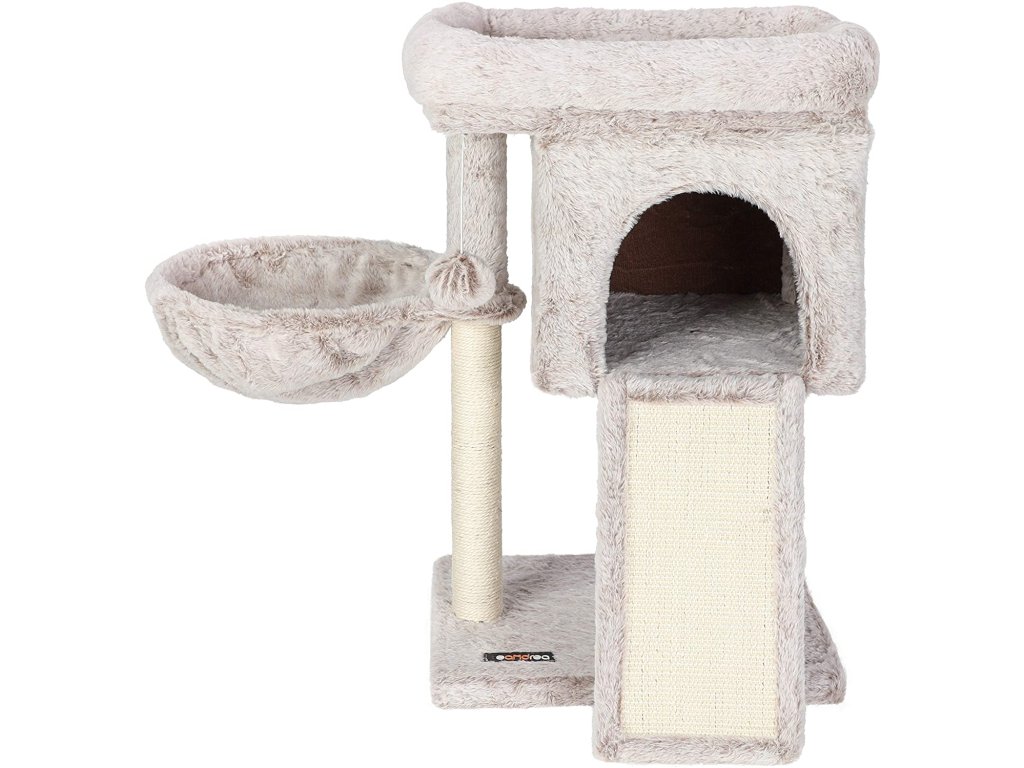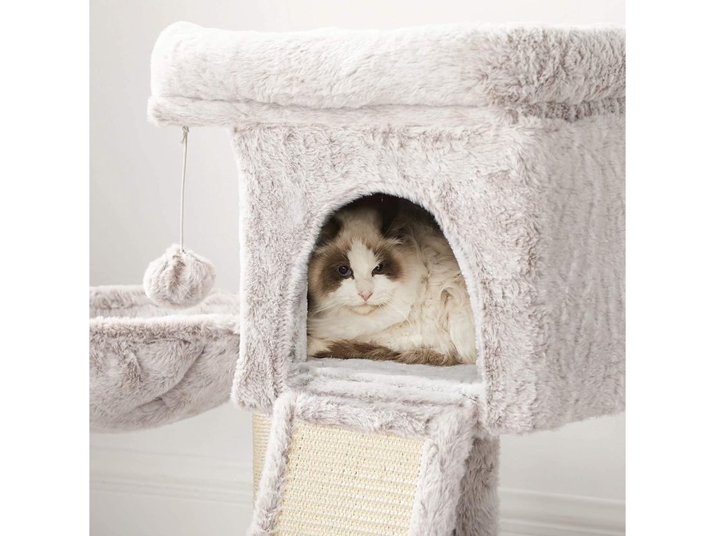 Stabilní kočičí strom s prostorným domkem, mnoha plyšovými odpočívadly a silnými sisalovými kmeny.