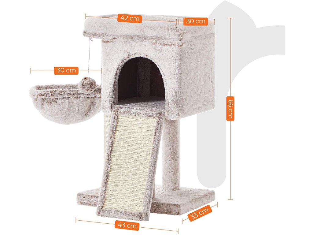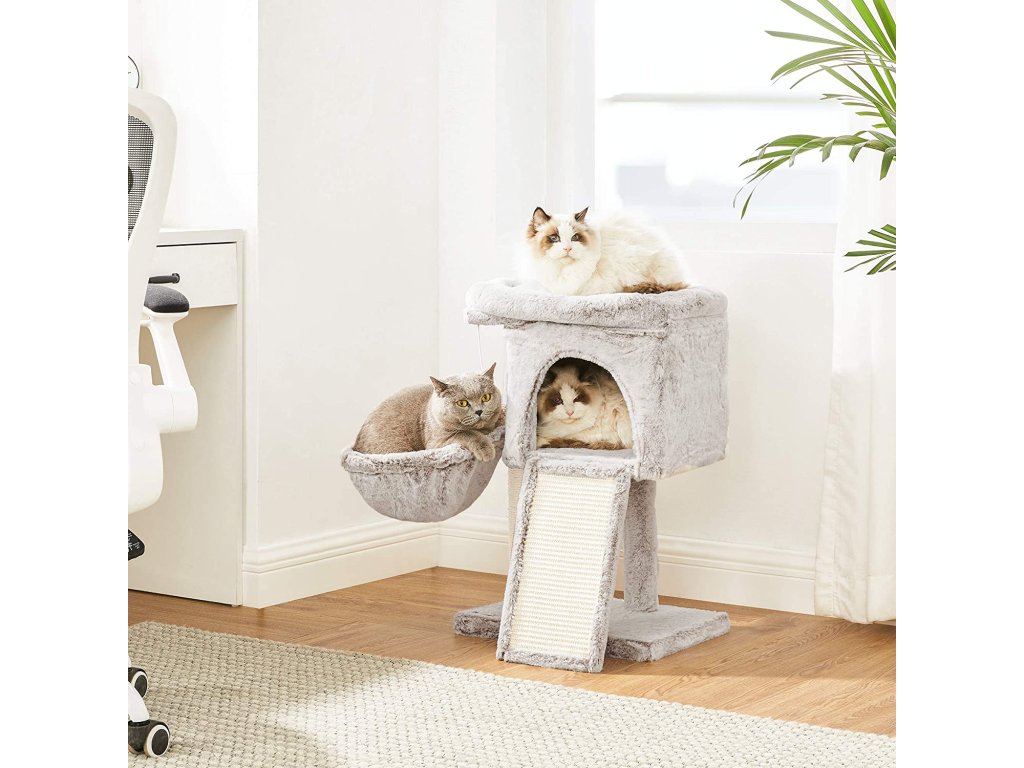 Stabilní dřevěný kočičí strom s prostorným domkem a mnoha plyšovými odpočívadly. Barva šedá.