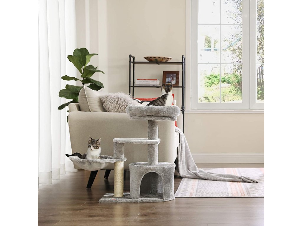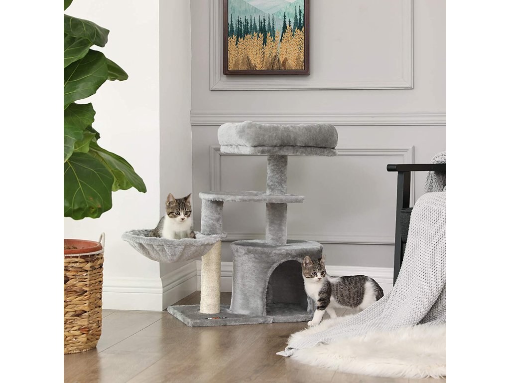 Stabilní kočičí strom s prostorným domkem, mnoha plyšovými odpočívadly a silnými sisalovými kmeny.