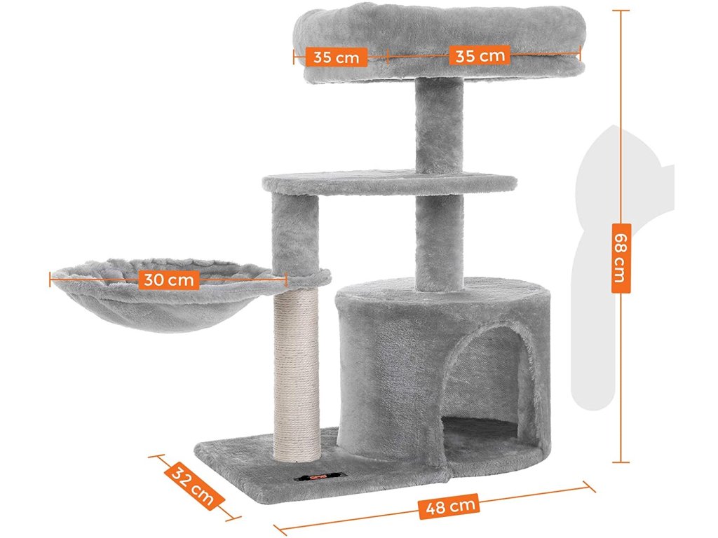 Stabilní kočičí strom s mnoha odpočívadly, domkem a silným sisalovým kmenem. Barva tmavě šedá.