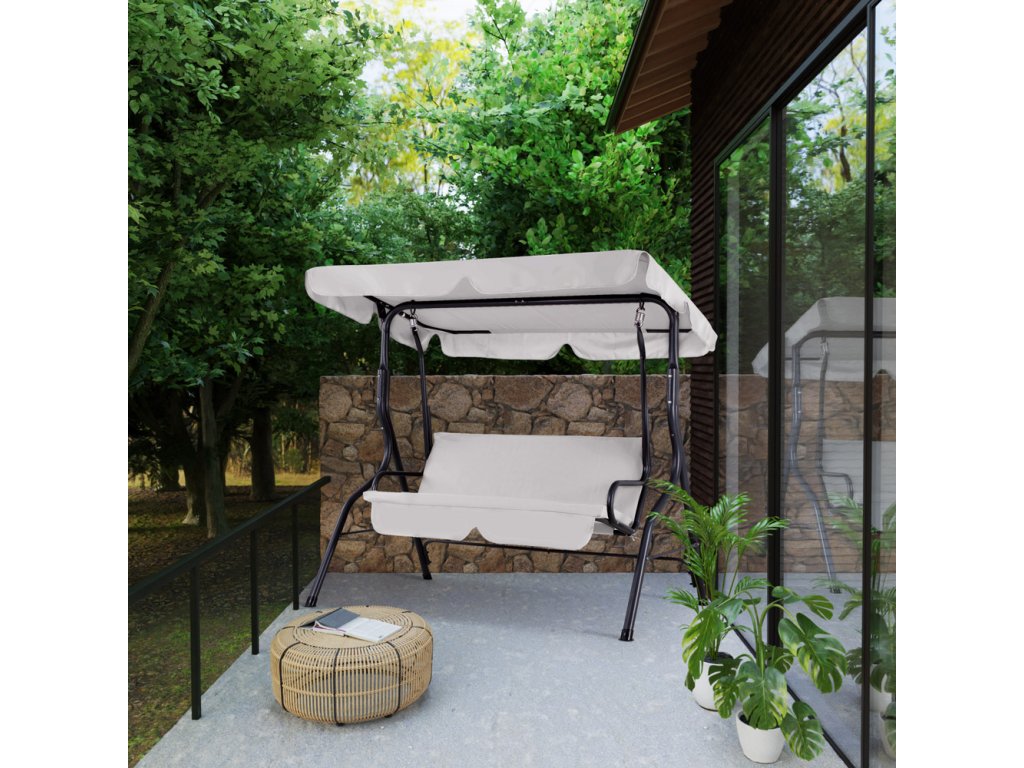 Venkovní zahradní houpačka pro 2 osoby s odkládacím stolkem. Pevná kovová konstrukce. Béžová barva.
