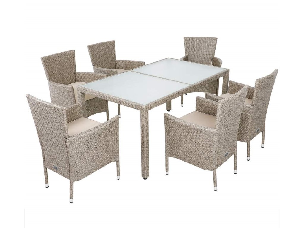 Pohodlná 13dílná zahradní ratanová sestava ke strávení pěkných okamžiků. Ratanová jídelní souprava přesvědčí nejen elegantním vzhledem, ale i dlouhou životností a odolnosti proti slunku. Nízká hmotnost konstrukce umožňuje snadný transport nábytku. Tento set není jen odolný proti vlivům počasí, ale i proti slunečnímu záření a zimě, což umožňuje skladování venku po celý rok. Skleněná deska stolu působí velmi ušlechtile a je snadno čistitelná. Pohodlné sedací polstry v béžové barvě jsou v souladu s ratanovou soupravou a jsou na zadní straně vybavené zipem a tím pádem snadno čistitelné. Za účelem ochrany před promočením vodou nebo jakýmkoliv nápojem je povrch polštářů impregnován.